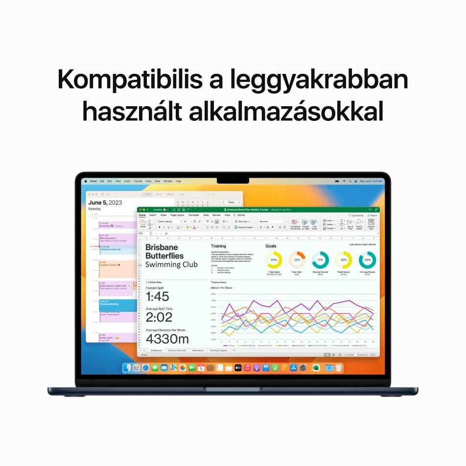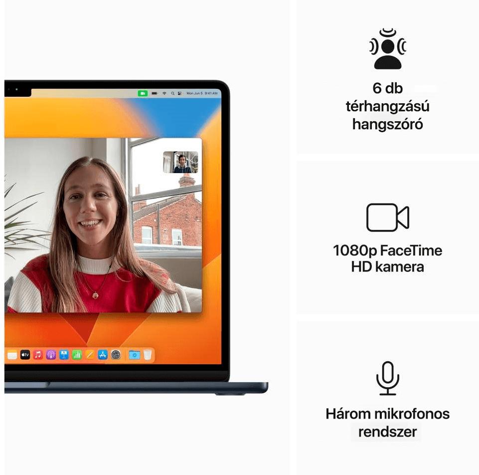 Végre itt az Apple legvékonyabb és legkönnyebb 15,3 hüvelykes laptopja. A mindössze 11,5 mm vastagságú készüléktest elegáns kialakítású. A teljesítményről egy korszerű, 5 nm-es Apple M2 chip gondoskodik. Villámgyors, 8 magos processzorral rendelkezik, amely bármilyen projekttel megbirkózik. A 10 magos grafikus chip pedig a legigényesebb alkalmazások és játékok működését is biztosítja. Emellett ne feledkezzünk meg a gépi tanulási feladatokat felgyorsító 16 magos Neural Engine-ről vagy a kiváló minőségű 1080p Face Time kameráról sem. Ez az új MacBook Air 15 M2.