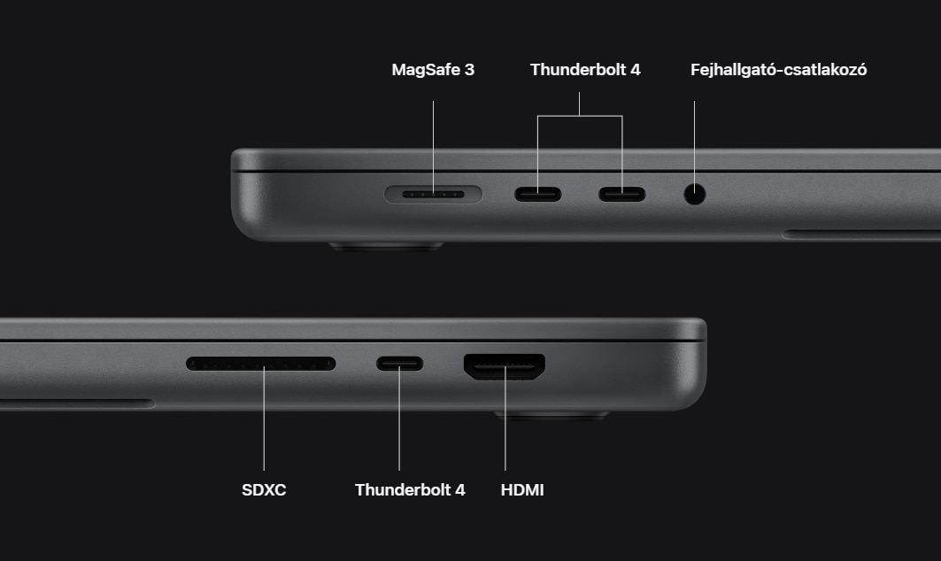 Másold át a fotóidat és a videóidat az SDXC-kártyaolvasóval. Csatlakozz tévékhez vagy kijelzőkhöz a HDMI-kimenettel, ami mostantól akár a 8K‑s felbontást is támogatja. Csatlakoztass kiegészítőket és további kijelzőket a három Thunderbolt 4 porton keresztül. És élvezd az akár kétszer gyorsabb adatátvitelt a Wi‑Fi 6E-vel. ![]() ![]() |
