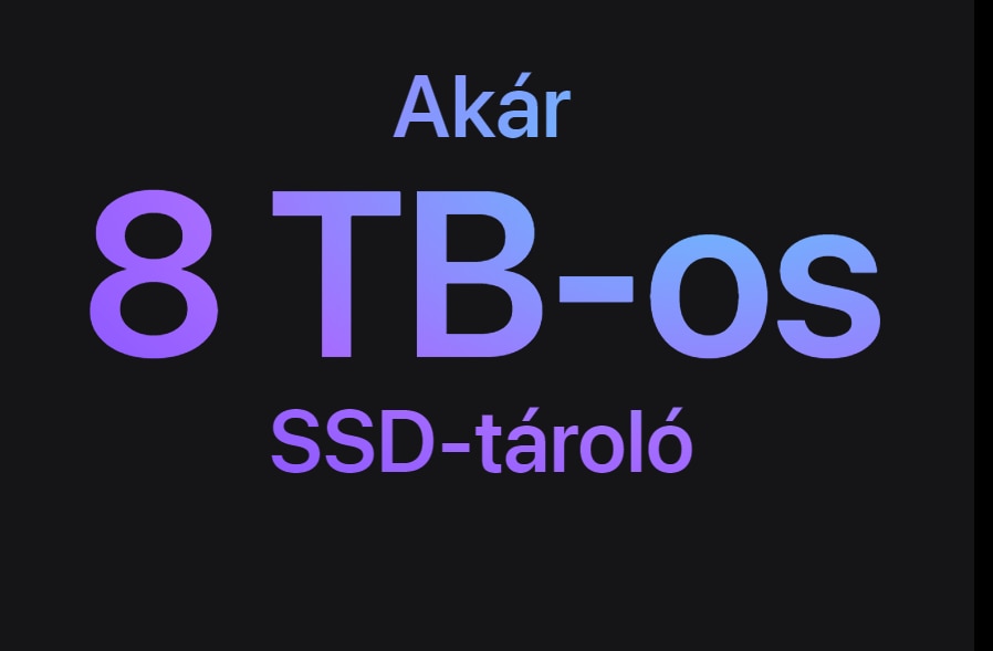Tarol a tárhely. A MacBook Pro teljes mértékben flashalapú tárhely-architektúrára épül, amelyet úgy terveztünk, hogy a mindennapi feladatok reszponzívan és villámgyorsan kezelhetők legyenek. A nagy fájlokat használó komolyabb munkafolyamatokhoz az akár 8 TB‑os konfigurációk kínálnak még jobb teljesítményt. |